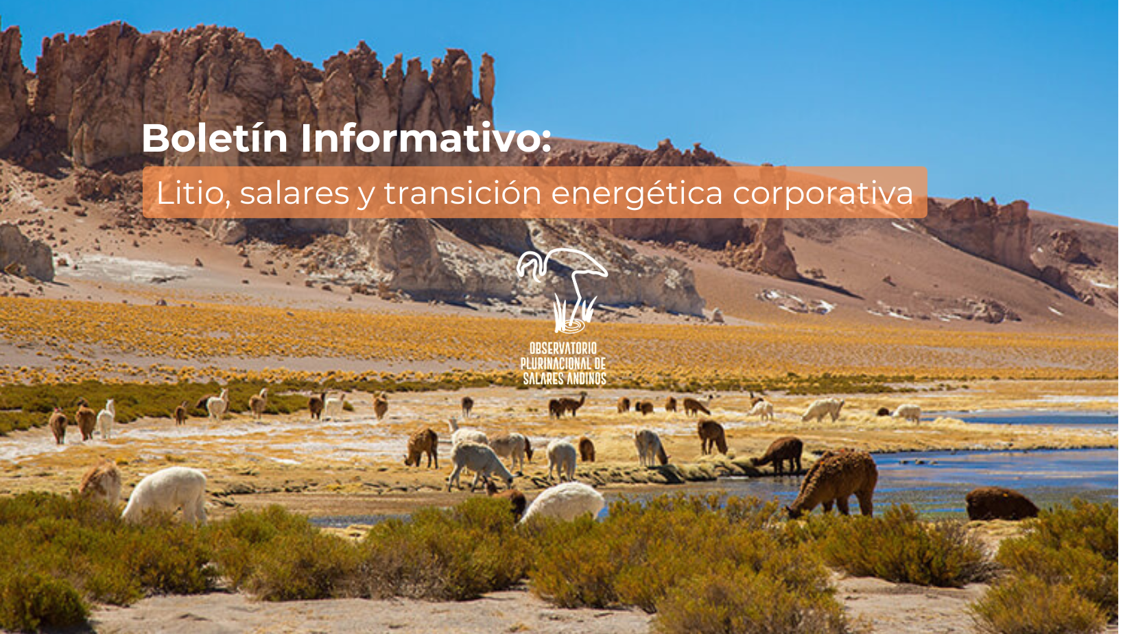 | Destacadas CONTRATOS DEL LITIO: EL ASPECTO AMBIENTAL -Entrevista en www.radiofides.com En entrevista con radio Fides, la coordinadora de OPSAL en Bolivia, Vivian Lagrava, abordó cómo las empresas de litio utilizan agua para extraer litio desde salares y humedales andinos, específicamente proyecto minero que se busca instalar en San Cristóbal, afectando a las comunidades de Enrique Valdivieso y NorLippipez, en la Provincia de Potosí. Escucha aquí CHILE Minera de Codelco puede ser absorbida por SQM en explotación conjunta del Salar de Atacama. El Ciudadano Las promesas legislativas de Boric al pizarrón: un 38% de avance general y nada en Cultura, Defensa y Pueblos Indígenas. El País Gobierno vuelve a reportar cifras top en exportaciones: brillan cobre y cerezas, no así litio y vinos. Biobío Cierre de proceso de recepción de antecedentes para procedimiento simplificado en yacimientos. Redimin ARGENTINA Argentina. El gobierno ofrece litio y cobre a las multinacionales y escamotea que carece de aprobación social. Resumen Latinoamericano Litio y flamencos rosados. DW Argentina Exar estudia recuperación de litio con extracción directa en Jujuy. Bn Américas Milei recibió al CEO de la principal productora de litio en el país que confirmó una inversión de USD 2.700 millones. Infobae Con el respaldo a Milei, la segunda minera más grande del mundo acelera sus inversiones en el país. La Nación La Terminal Puerto de Rosario celebra el primer embarque de litio exportado a China. Dangadai BOLIVIA Autoridades no dan detalles sobre explotación del salar de Coipasa. El Diario Bolivia en riesgo de perder oportunidad de industrializar su litio. El Ciudadano Sesión para aprobar contratos de litio se suspende por disturbios en el debate. La Razón Advierten desanimo de inversión extranjera si la ALP continúa postergando aprobación de ley del Litio y contratos. Agencia Boliviana de Información Revisa el Boletín de Noticias también disponible en el sitio web www.salares.org Para más información escribir a Javiera Ortiz a comunicaciones@salares.org |